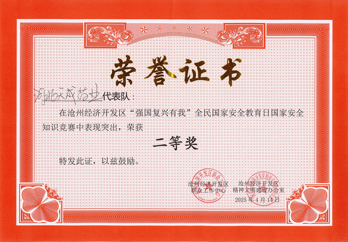 滄州經(jīng)濟(jì)開發(fā)區(qū)舉辦“強(qiáng)國復(fù)興有我”國家安全知識(shí)競(jìng)賽活動(dòng) 天成藥業(yè)代表隊(duì)榮獲二等獎(jiǎng)
